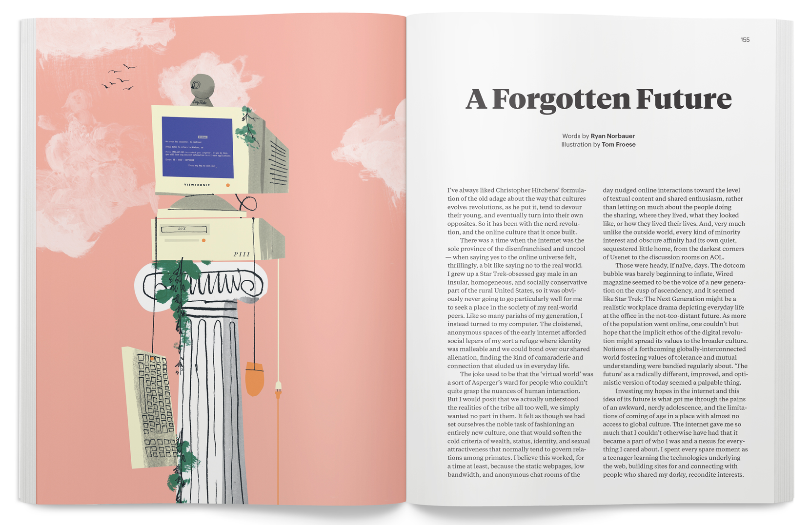 There was a time when the internet was the sole province of the disenfranchised and uncool—when saying yes to the online universe felt, thrillingly, a bit like saying no to the real world. I grew up a Star Trek-obsessed gay male in an insular, homogeneous, and socially conservative part of the rural United States, so it was obviously never going to go particularly well for me to seek a place in the society of my real-world peers. Like so many pariahs of my generation, I instead turned to my computer. The cloistered, anonymous spaces of the early internet afforded social lepers of my sort a refuge where identity was malleable and we could bond over our shared alienation, finding the kind of camaraderie and connection that eluded us in everyday life.