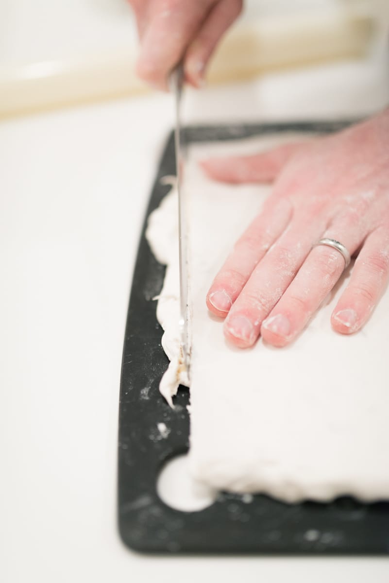 Add second sheet of wafer paper to top, gently roll it to affix to the nougat surface, and square off edges as best as possible, first by molding with your fingers and then by cutting with a knife.