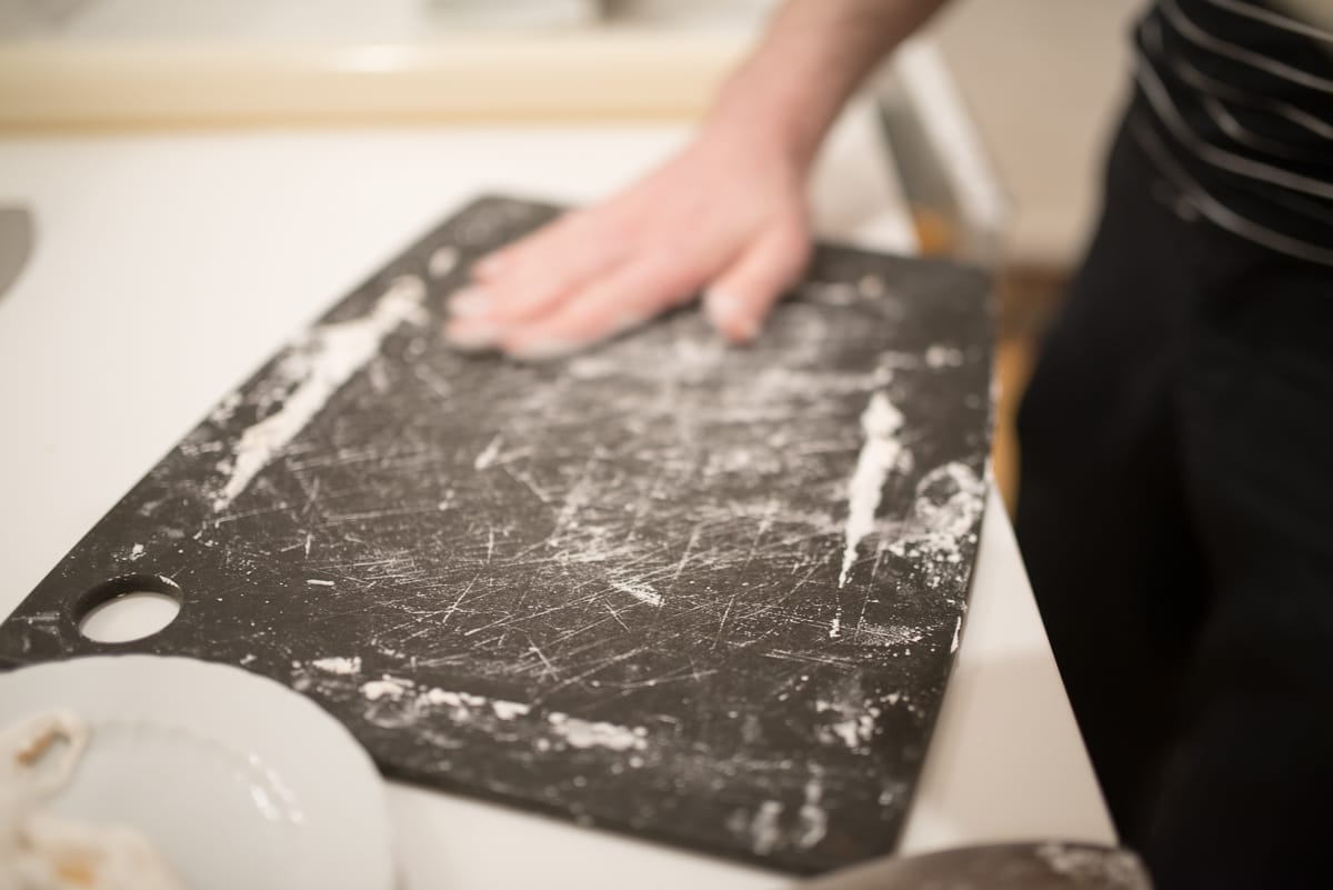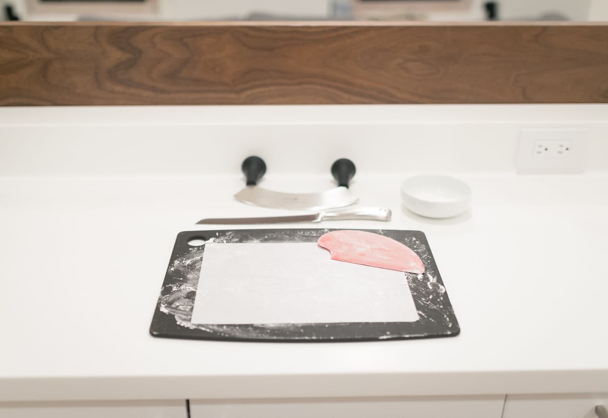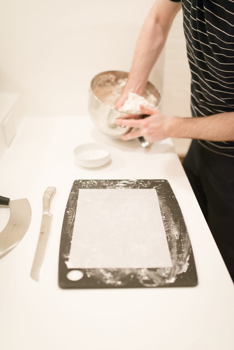 Have a bowl of cornstarch nearby for quickly re-coating things, especially your hands, in the heat of the moment. Dust your bowl scraper and cutting board in cornstarch also.