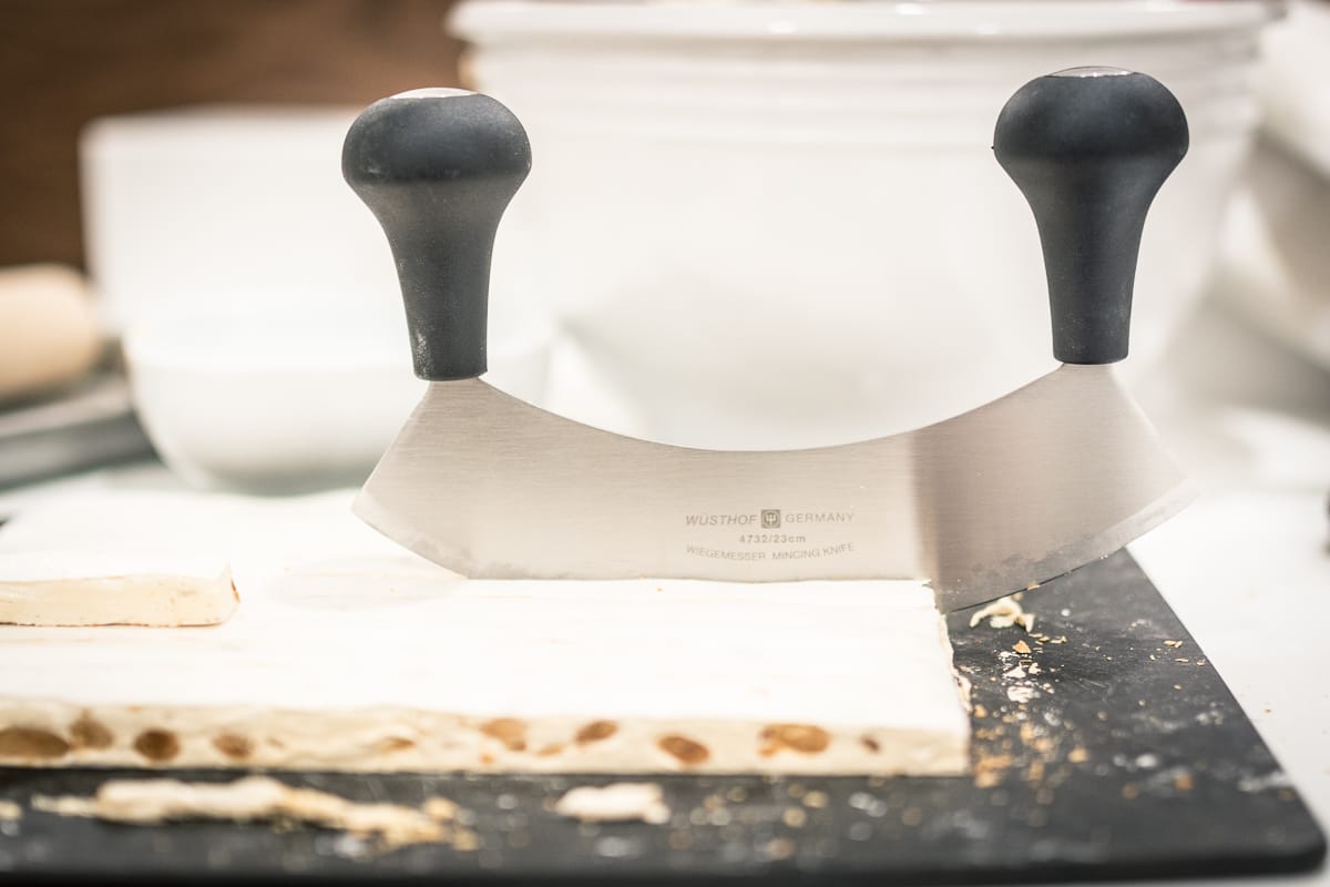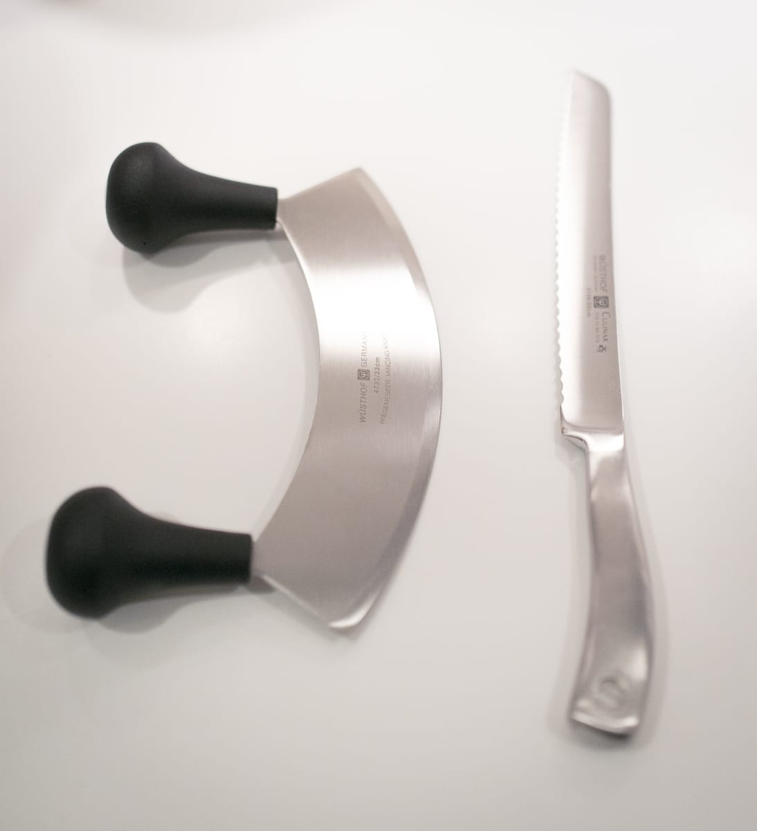 9" mezzaluna and 9" serrated knife (Wüsthof, Germany) The mezzaluna is for making incisions to create the long strips. The serrated knife is for cutting the long strips into smaller bite-size pieces, should you choose to do so.