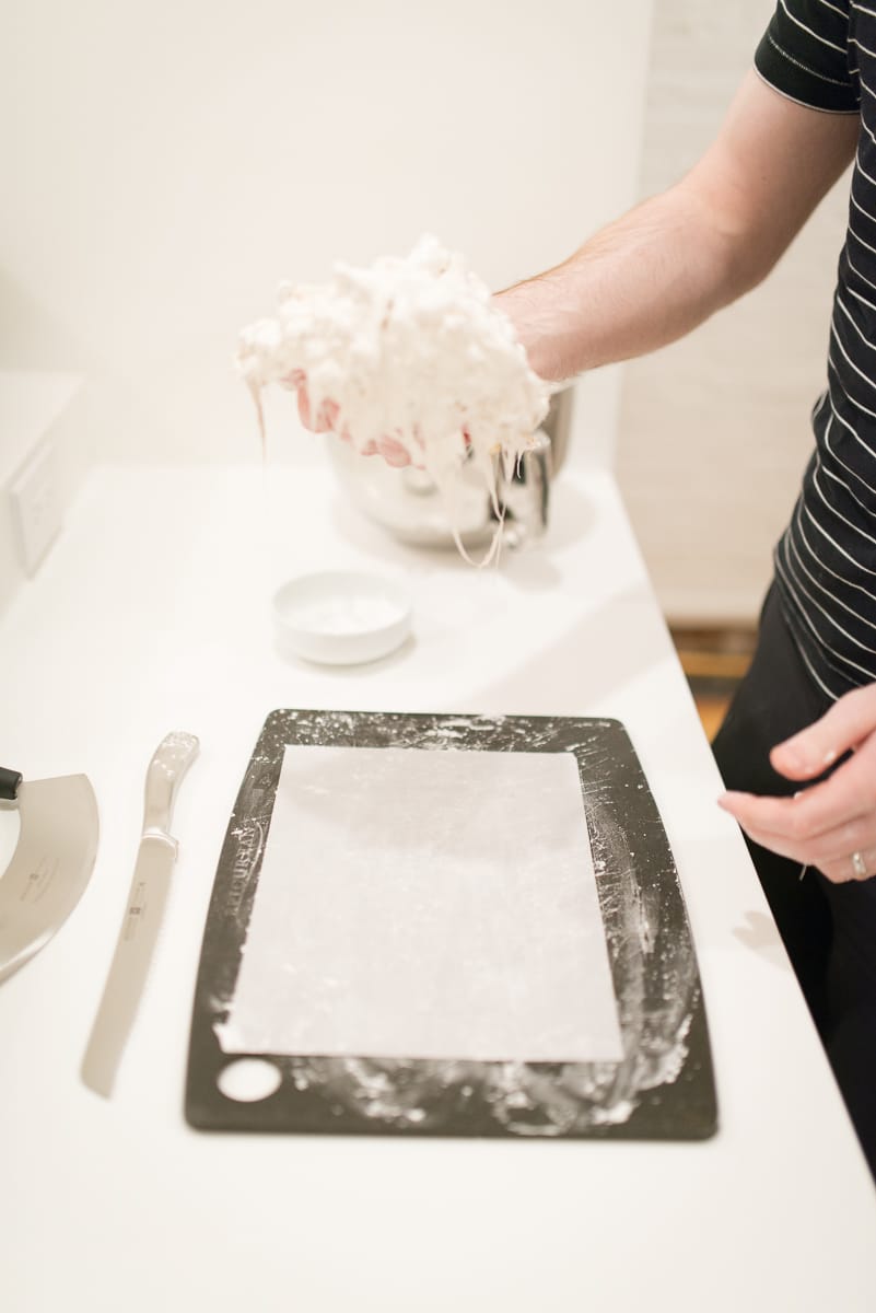 Moving quickly, scrape the nougat out onto the prepared wafer paper on the cutting board, flattening it into a sheet.