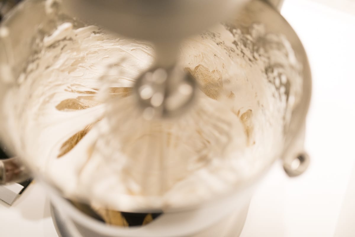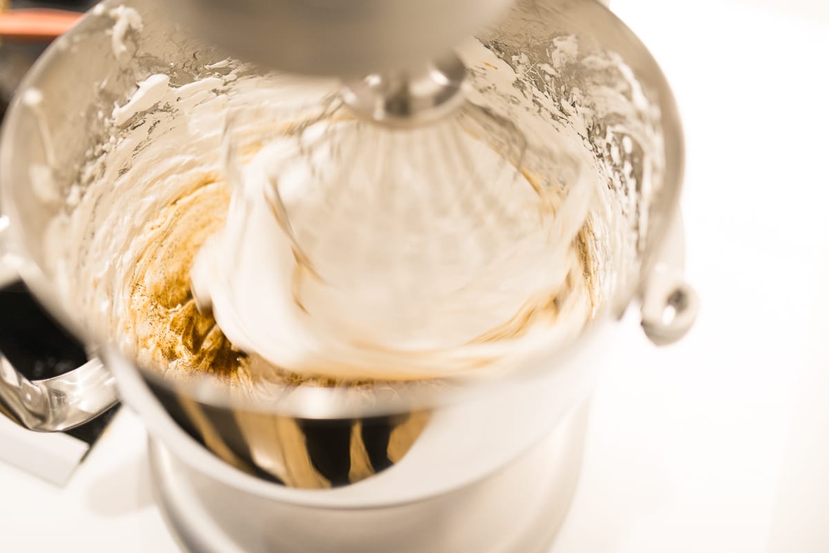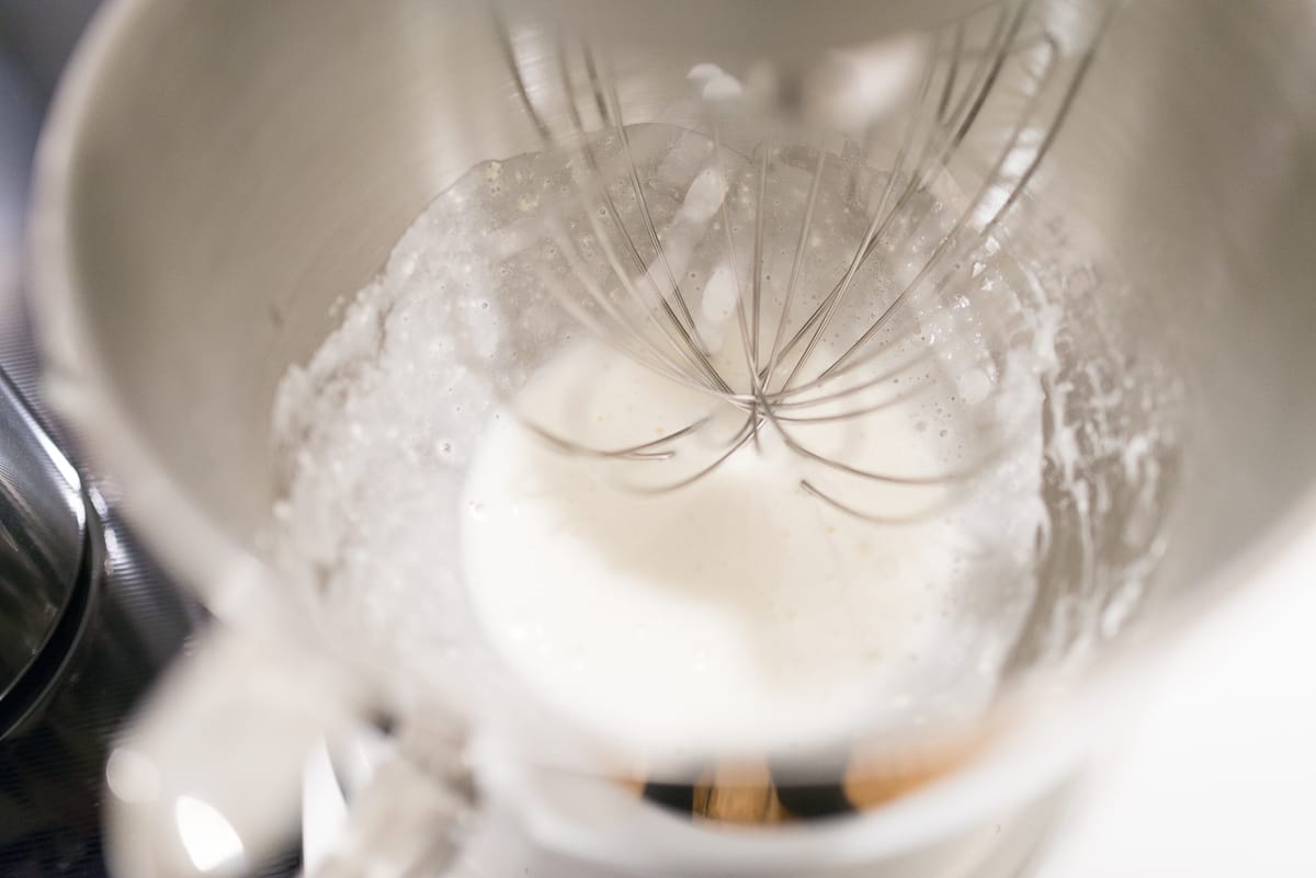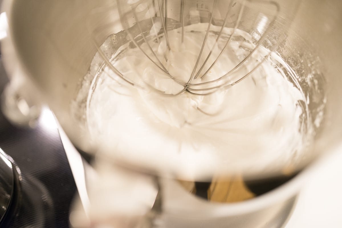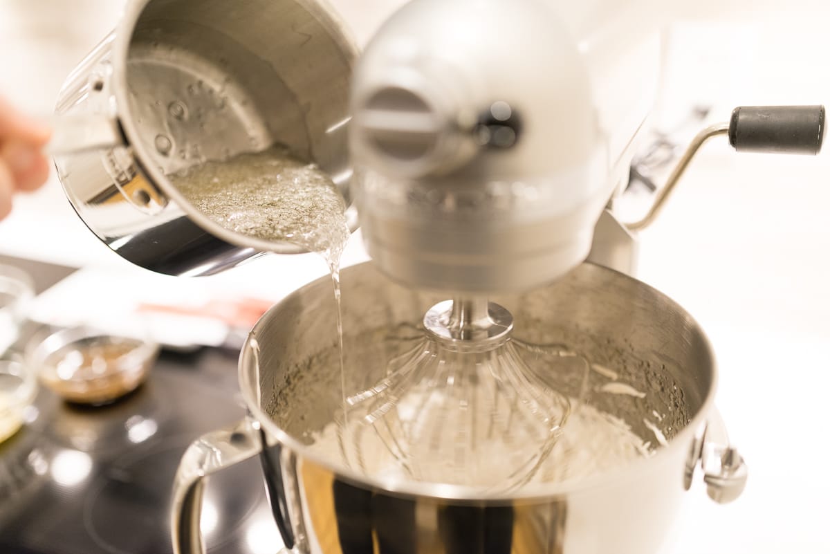 When the honey has reached 120°, remove the honey immediately from heat, reduce mixer speed, and slowly stream the hot honey into the whipping egg whites, making sure not to add them so quickly that the egg whites collapse. Return mixer to high speed and continue to aerate the whites thoroughly.