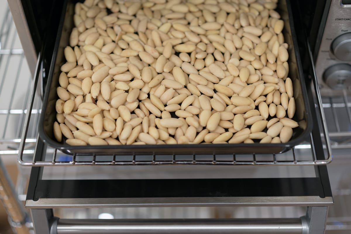 You don't want any burning or charring, but there will be a rapid and radical change in their aroma and flavor when they go from being raw to ready; I'm always impressed by how definitive a tipping point there is between these two states. The only way to know for sure that they are done is to cool one off and taste it. There should be no hint of rawness at all and only a gentle toasted flavor. The importance of this step can't be overstated; since nougat is so subtly flavored, the taste of the almonds is central to the confection. If you burn the almonds, start over.