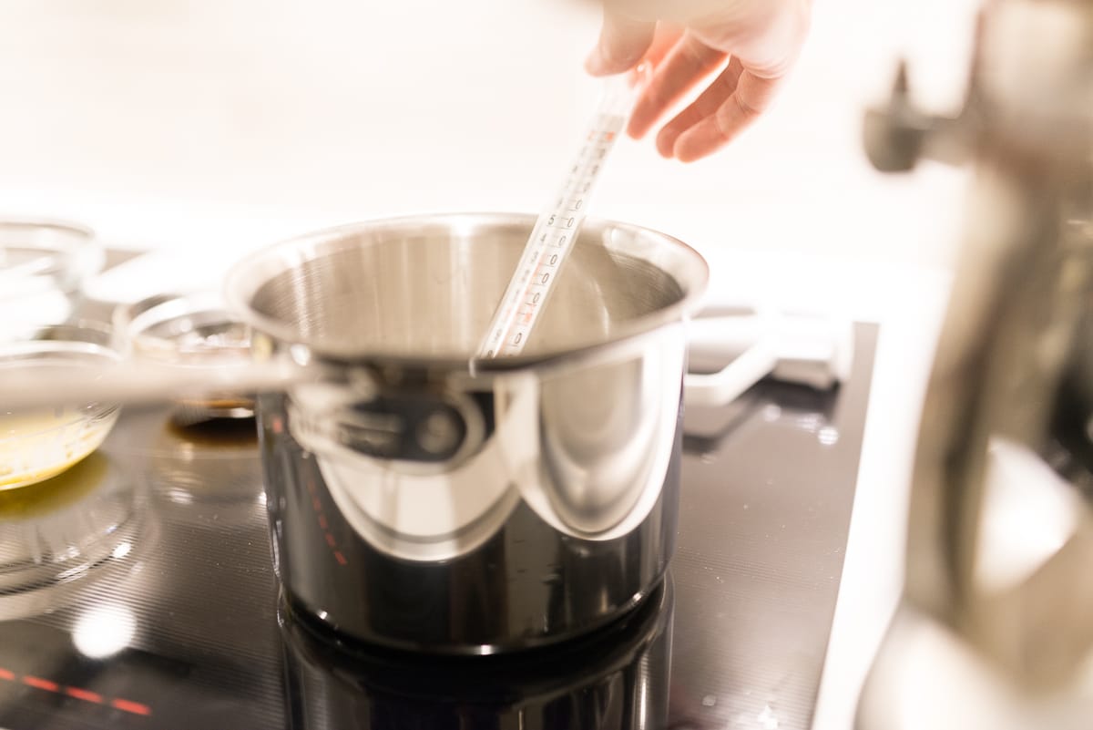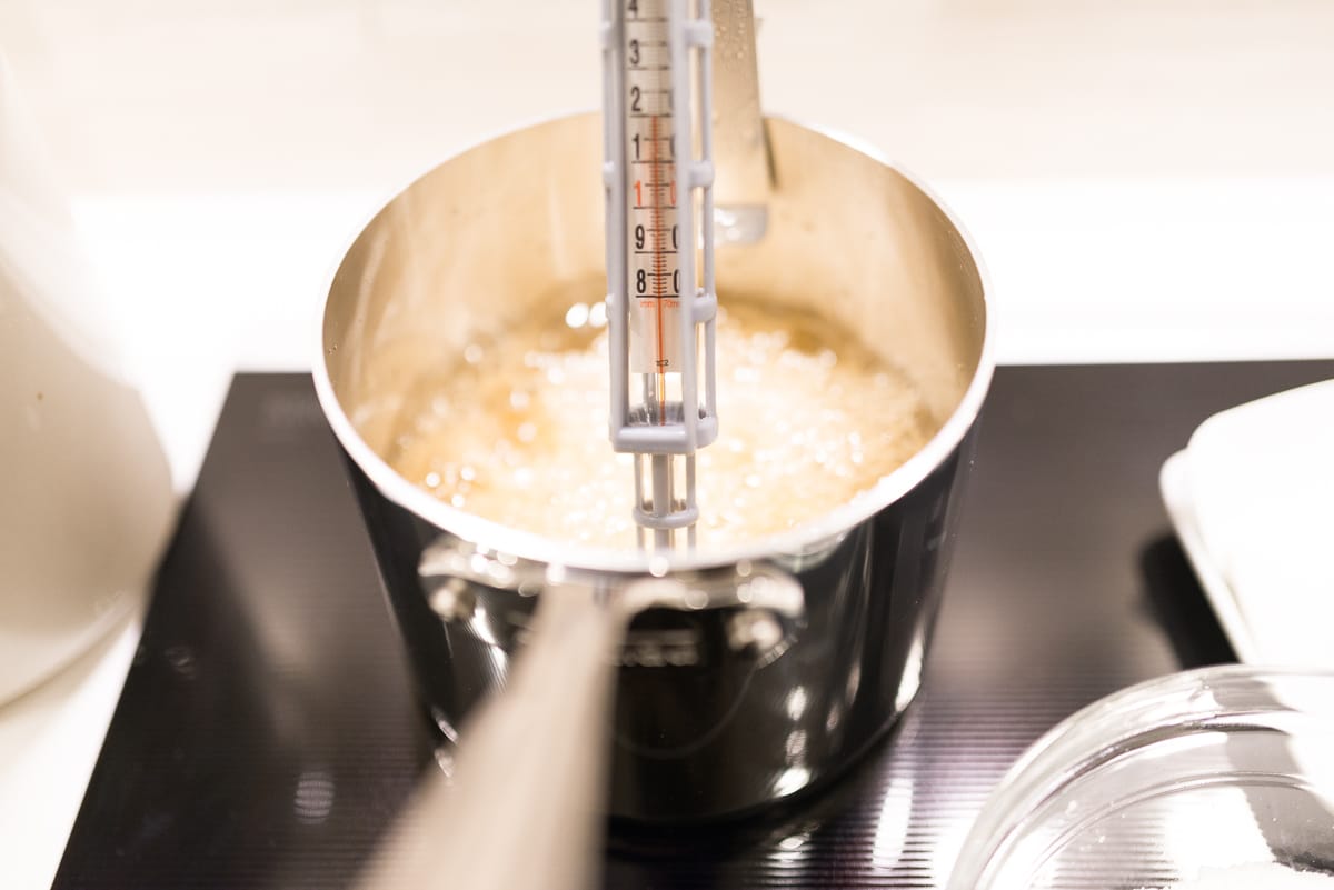 As the honey is whipping into the whites, begin heating the 380g sugar, water, and glucose syrup on high.