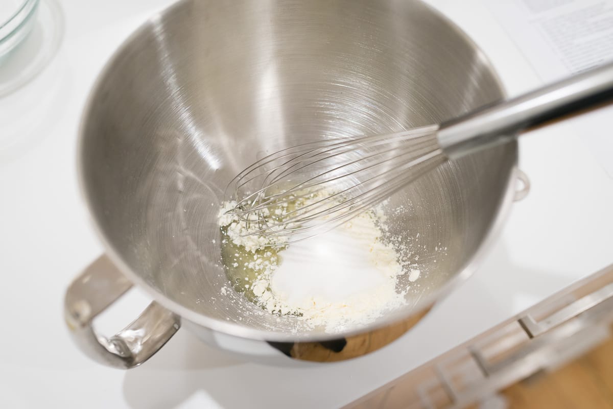 Fit the bowl into the mixer with its whisk attachment in place. Leave the mixture to sit while performing the other steps, allowing the dried albumen to re-hydrate.