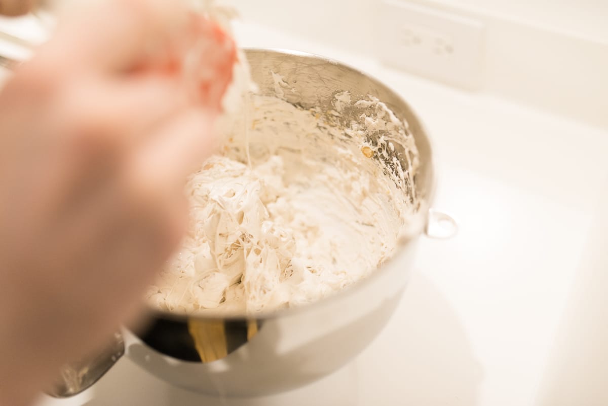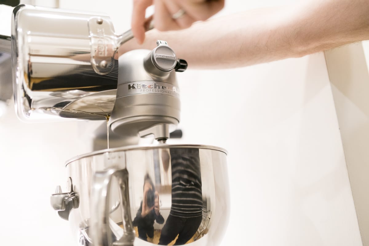 When adding the honey, ensure that that the mixer is operating at slow enough a speed as to avoid the honey being primarily spattered against the high walls of the bowl rather than being incorporated into the egg whites.