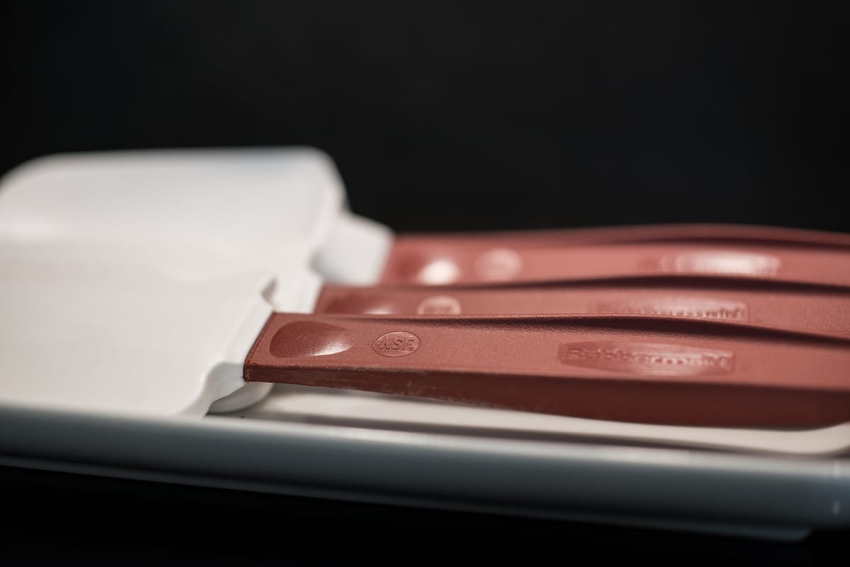 Any heat-resistant silicone spatulae will do. I like the commercial ones from Rubbermaid.