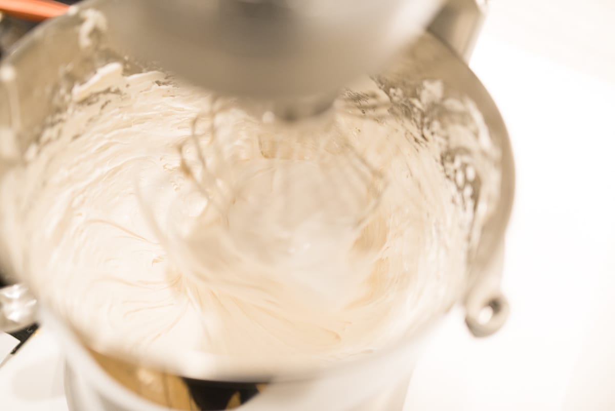 After the sugar mixture has been added, whip the nougat at high speed for about three minutes, allowing it to cool slightly and to increase in loft/volume.