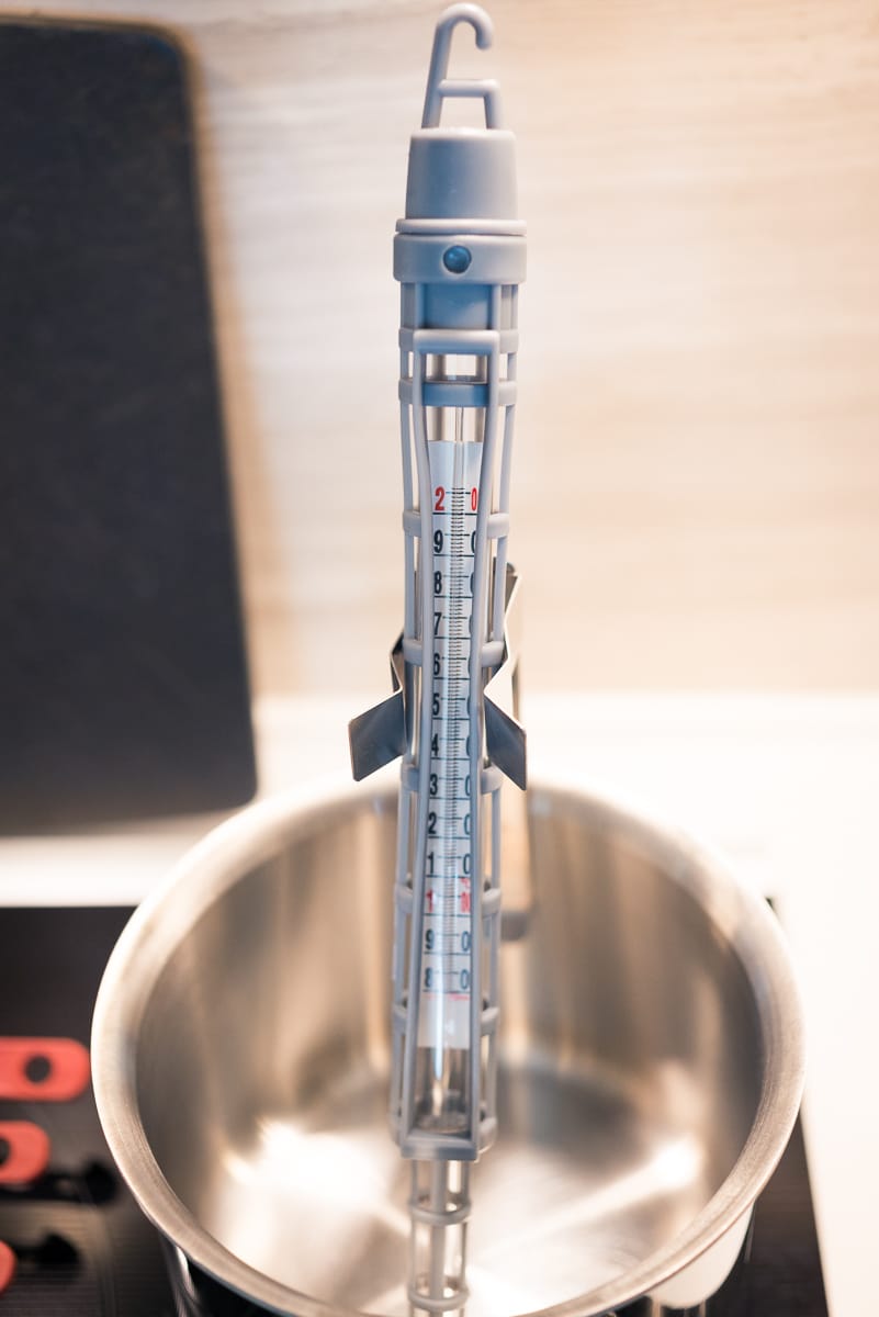 I like these because they have a lot of steel in them, which makes heating up on my induction range faster. For the sugar/glucose mixture particularly, you want to heat the syrup as rapidly as possible to avoid burning the sugar and ending up adding an ugly brown tint to your nougat. You also want a saucepan with high sides and a small diameter, as the All-Clad 2-quarts have. This makes it possible to submerge the temperature probe properly into the liquid without having to rest it against the bottom of the pan. In wider-diameter pans the liquid is too shallow to allow an accurate reading.