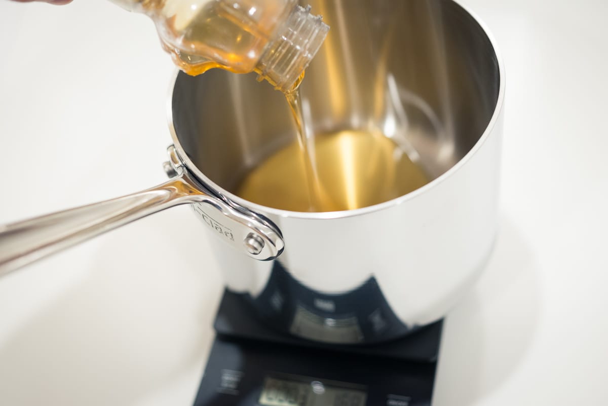 Since the honey is quite viscous (making it difficult to move between vessels) and is cooked by itself, it is easiest simply to tare the scale with one of the saucepans and measure the warmed honey directly into it.