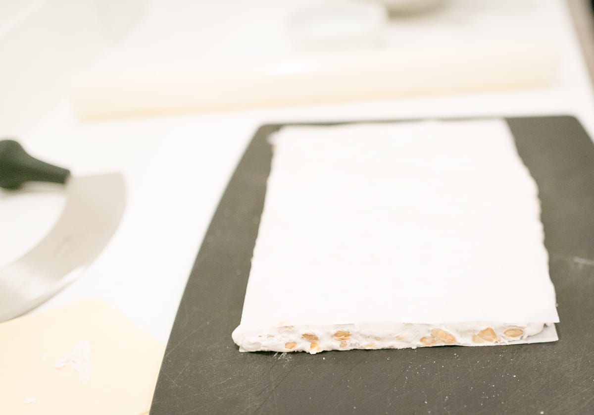 It's a race against the clock as soon as the heated sugar mixture is added to the egg whites; with each passing minute the nougat becomes less pliable. You'll thus want to get everything lined up and in order for the tasks that come after.