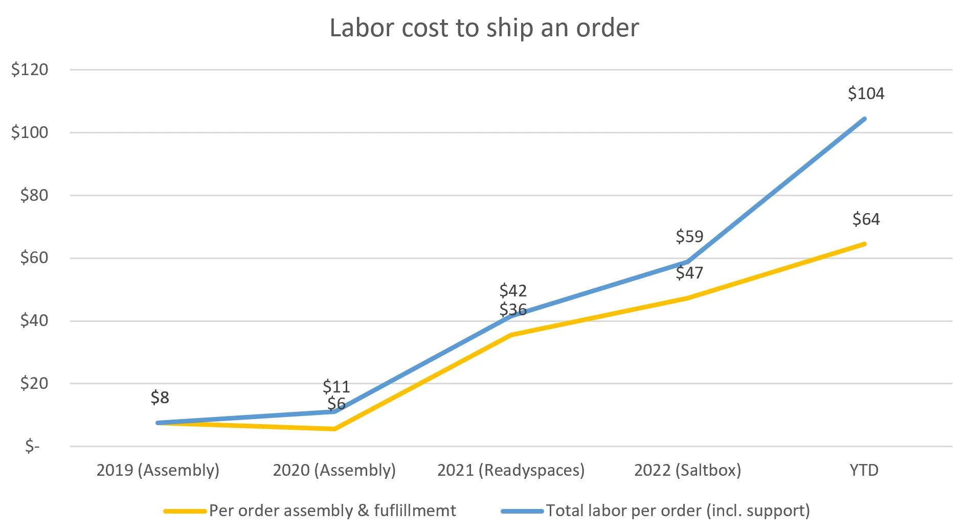 Around the same time, I had a suspicion that our warehouse and client support operations had become wildly inefficient, so I decided to take a look at what it was costing us (in labor alone) to ship an order. I discovered that we had gone from $8 per order in 2019 to $104 per order in 2023, an order of magnitude jump in costs with no appreciable improvement in the client experience.