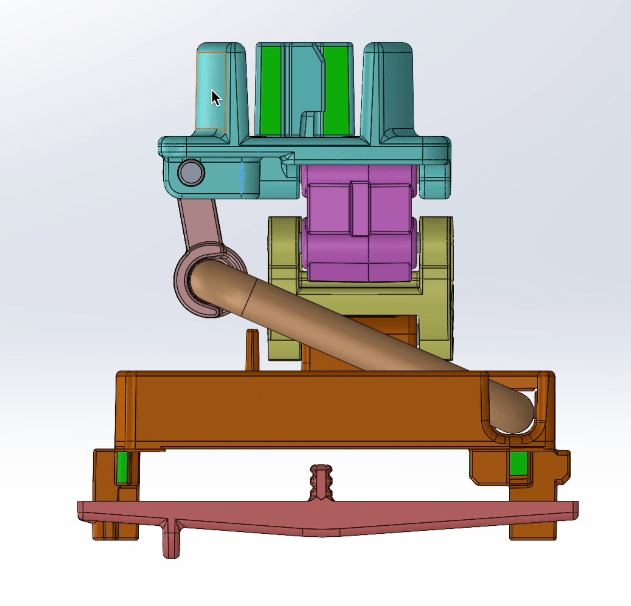 This concept was further extended to the critical wire-to-slider interface, which is the cause of stabilizer rattle—the main problem we're trying to solve. For this, a preload beam in the form of a metal spring is clipped into the slider. It hangs down from the slider ceiling and presses down on the stabilizer wire from above, gently preloading the wire against the floor the slider and preventing any gap between those two, at all points of the stabilizer's travel. Brass was chosen for this preload spring for its good sliding properties against stainless steel. (We didn't end up choosing a molded-in plastic beam like we did on the wire clip, due to concerns about long-term material creep under load with this relatively highly cantilevered beam.)