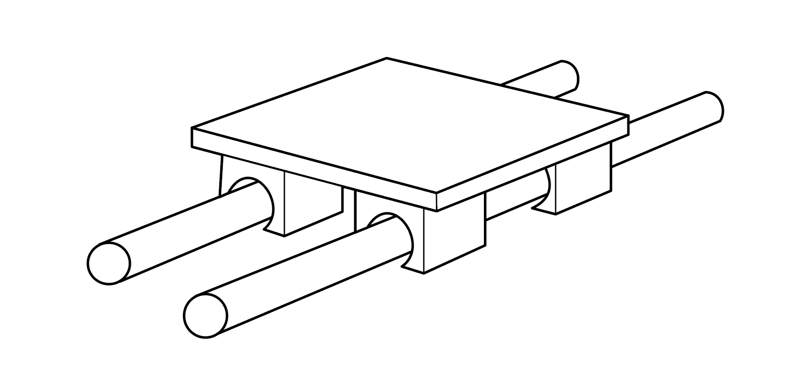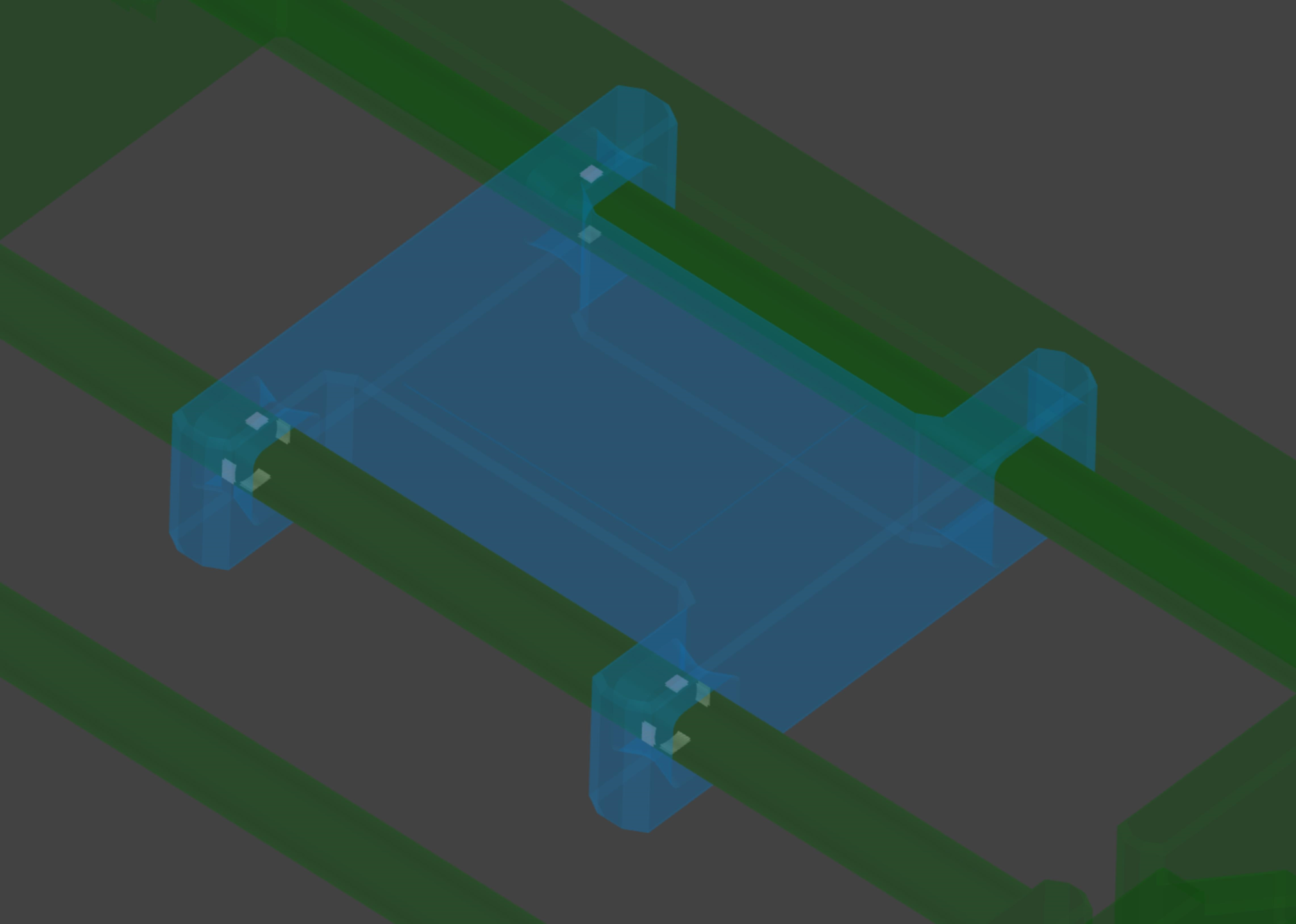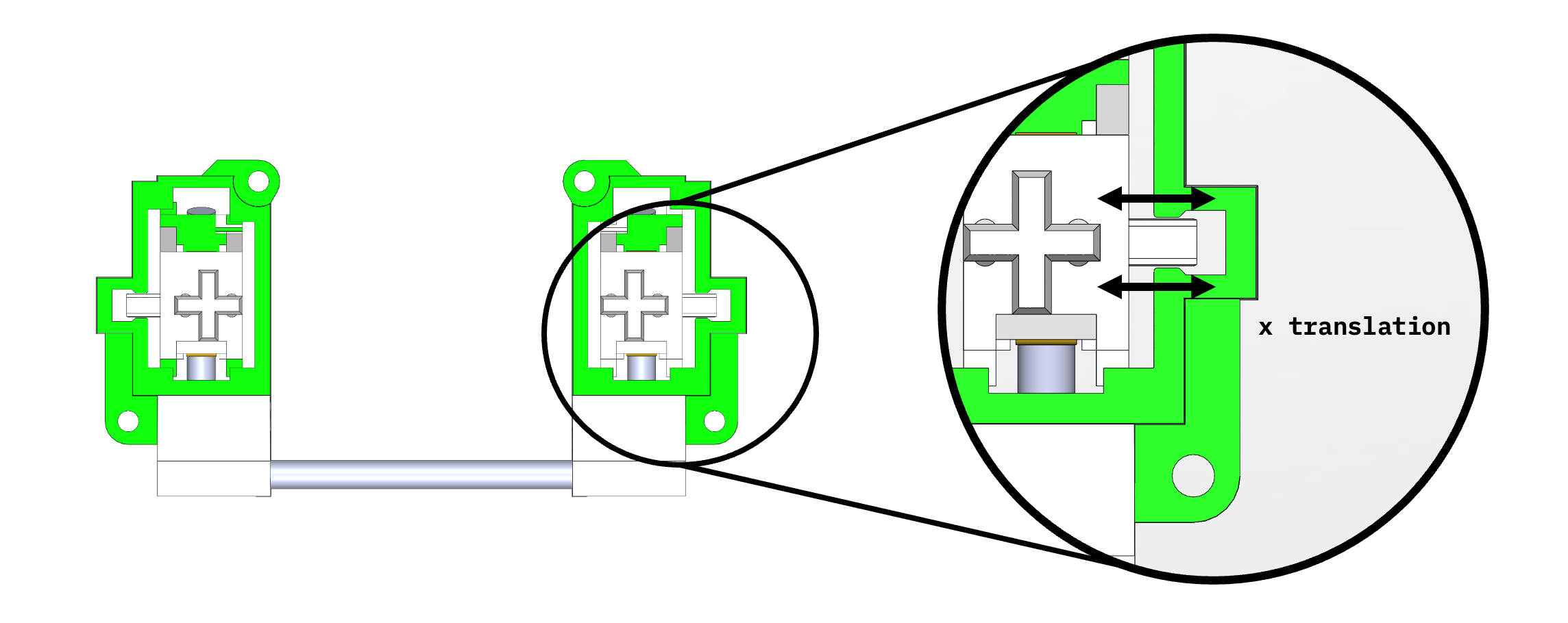 A kinematically optimized version of the same design would look like the following blue slider with white contact faces against the rod. It has only exactly the number of contact surfaces—and no more—that are required to constrain the desired degrees of freedom. Note that the bottom-right bushing makes no contact whatsoever with the rod, and the top-right bushing does so in only two targeted spots (preventing rotation of the carriage about the axis of travel). This makes the system highly robust to variations but it still exactly and smoothly performs the designed mechanical movements. That is: it is both tight and loose.