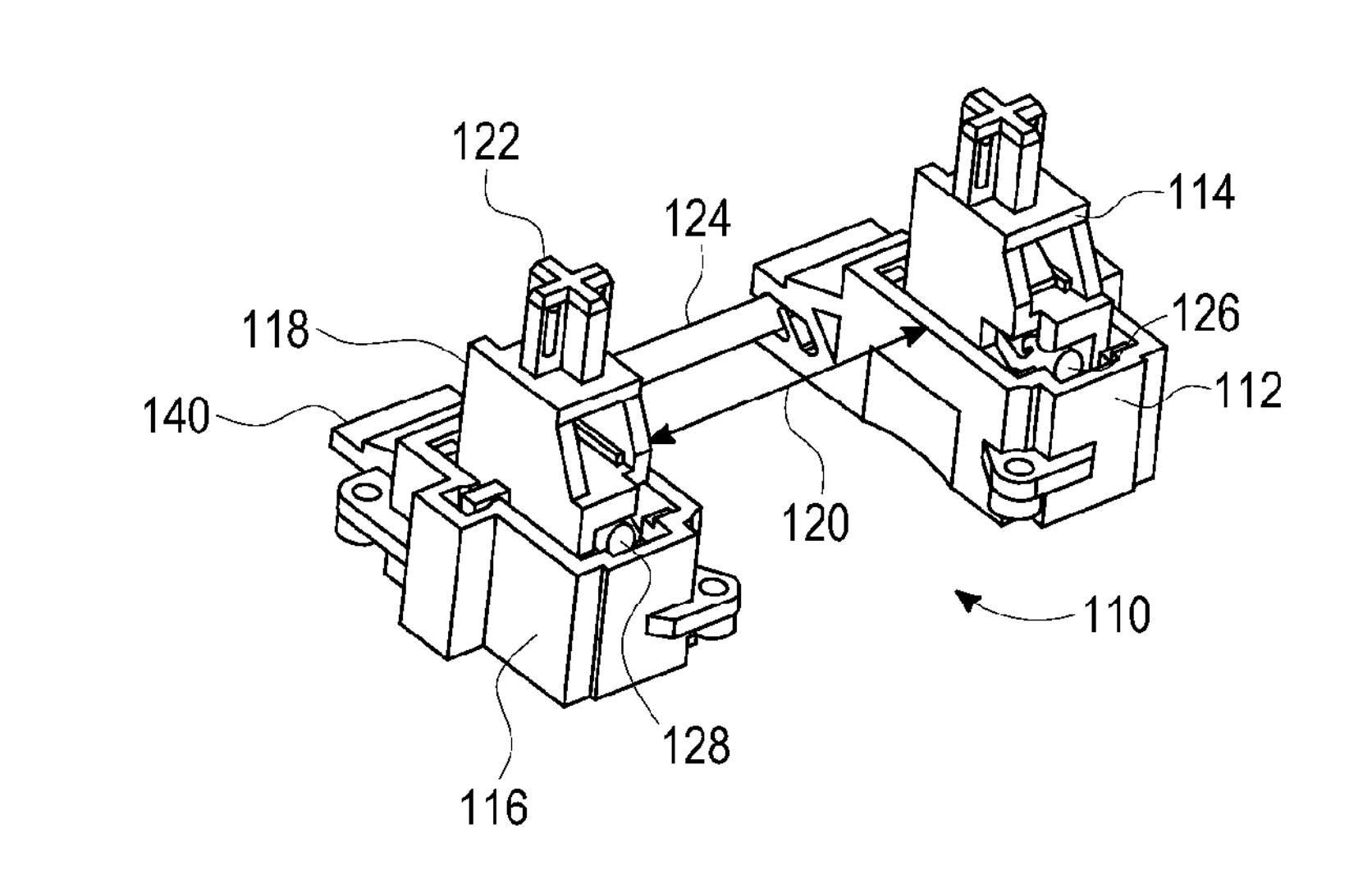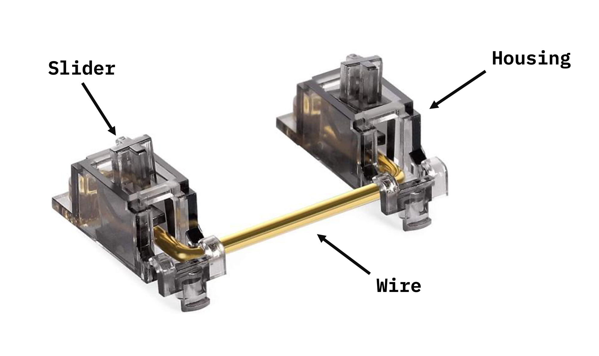 Below is the architecture of a traditional Cherry-type stabilizer. A keycap is connected to two sliders via a press fit onto their cruciform mounting points. Those sliders move up and down with the key travel, and a spring-loaded switch (also pressed into the keycap) is situated between the two stabilizing ends. A rotating wire clipped into the stabilizer housings has two extension arms that insert into the two sliders, pulling them up and down together in tandem and thus creating the anti-seesaw effect.