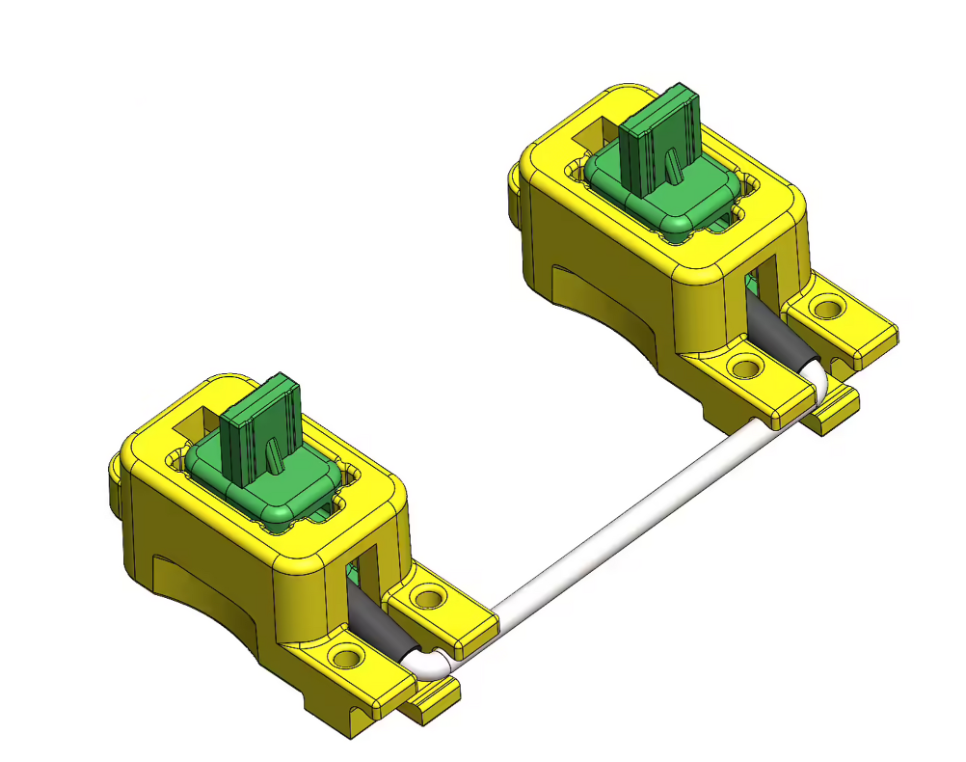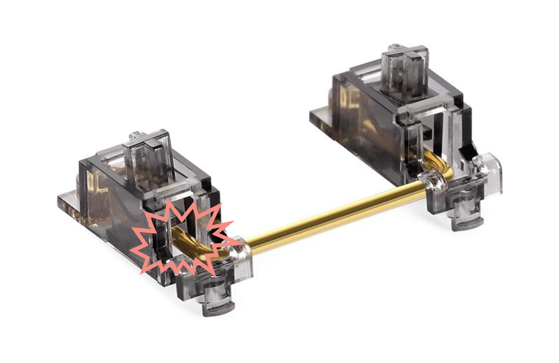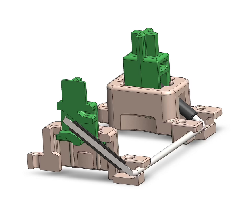 In the one spot we have a joint that isn't a perfect pin type, the clip in the housing that holds the rotating wire. For that, we use a preload beam molded into the housing pressing against the wire to ensure zero clearance at all times. If you assemble a switch in a test fixture with a normal stabilizer and shake it, it makes a great deal of noise. If you assemble a Norbauer-type stabilizer into the same and shake it, it is entirely silent.