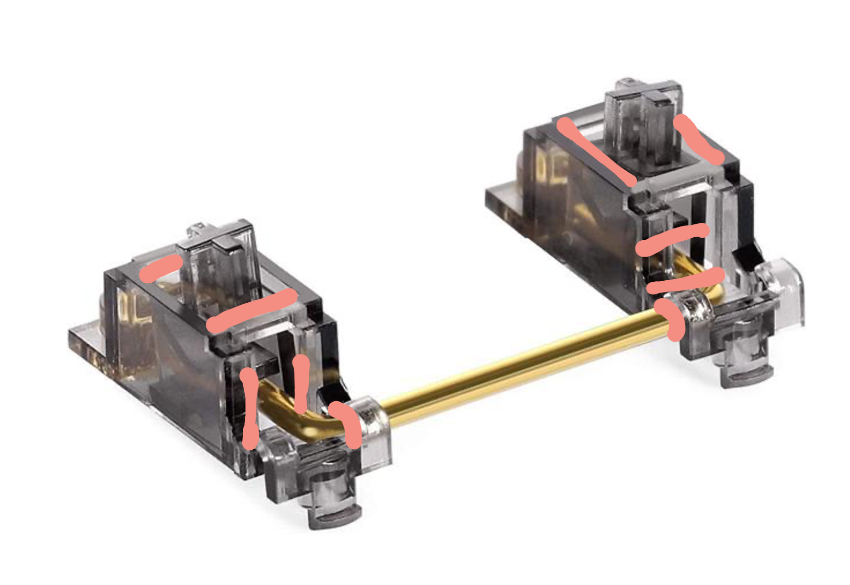 There are two primary sources of unwanted sounds. I'll formalize some keyboard community terminology here by calling the first rattle, which refers to the sound of the hard wire linkage striking against the hard plastic surfaces in the interior of the slider. This is by far the most prominent and displeasing source of stabilizer noise.