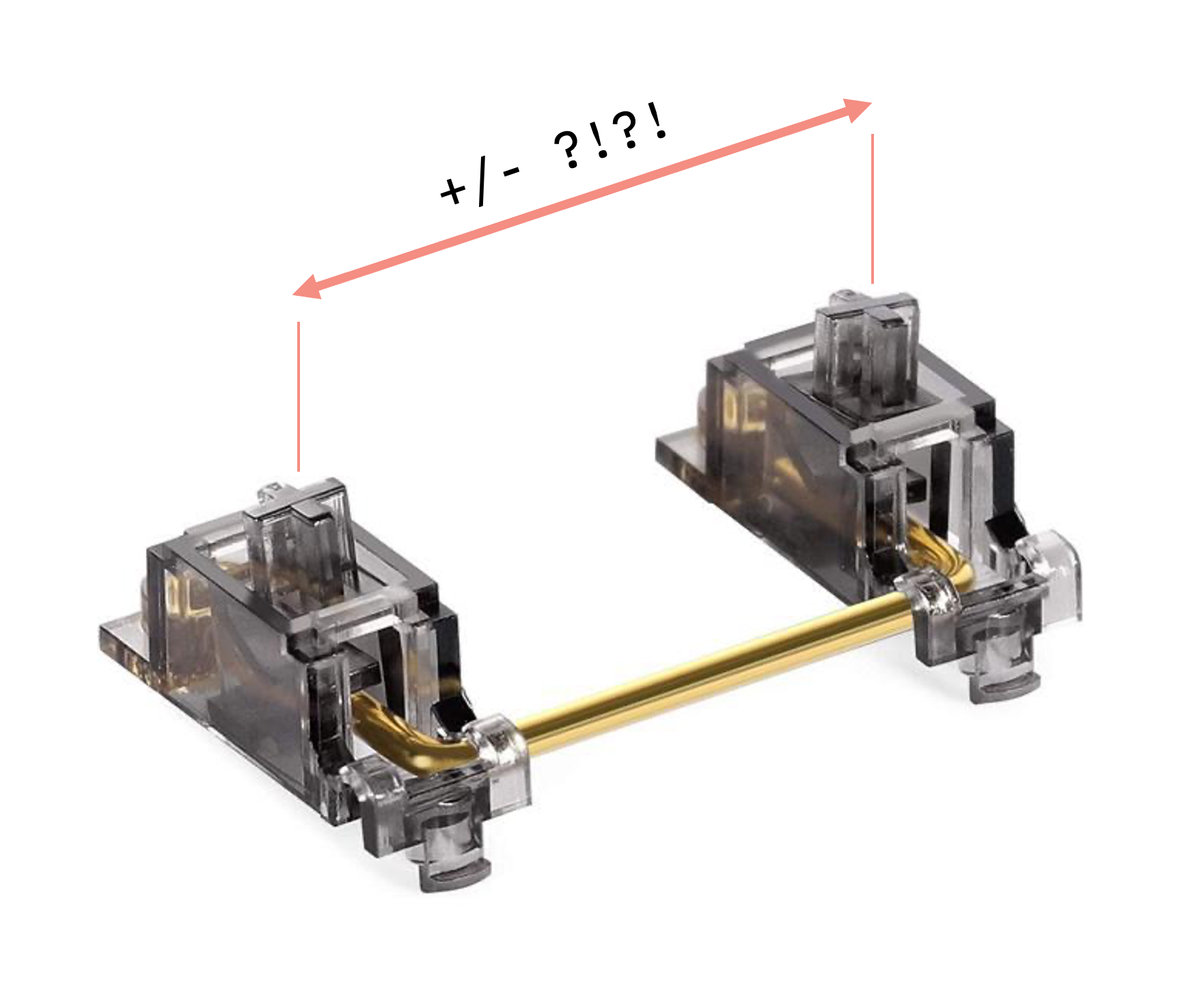 There is one additional complicating factor, which is that long keys like spacebars frequently vary between manufacturers in their stem spacing length. Any widely applicable stabilizer design must therefore accommodate a remarkable degree of dimensional variability.