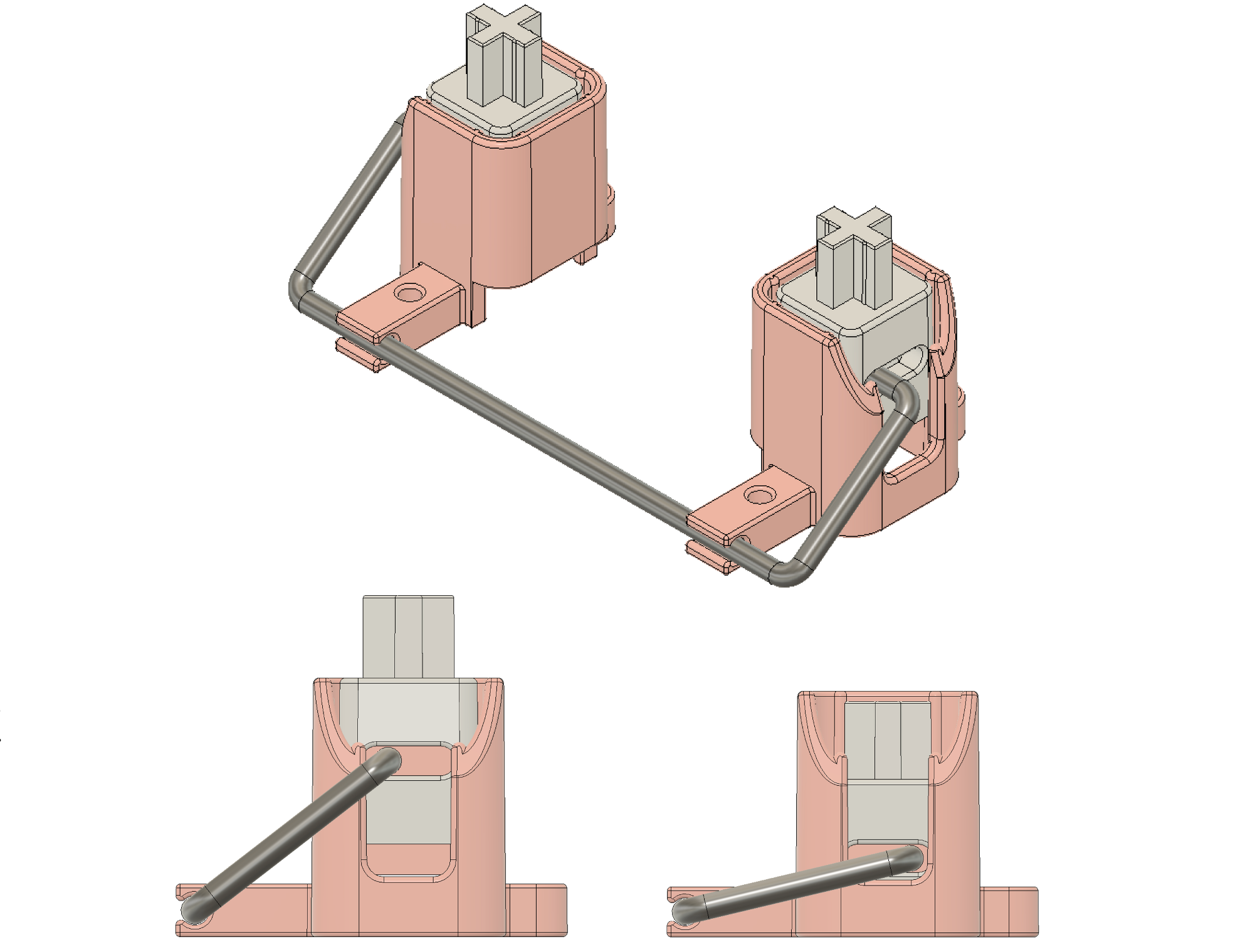With a sufficiently polished mold and shiny surface finish for the rubber overmold on the wire, it was actually possible to get decent acoustic behavior out of this approach. Putting one's ear close to the stabilizer in operation, however, a bit of squeak was perceptible. This could be mitigated with a dry graphite lubricant, but that would likely wear away with time and defeat the whole purpose of lubricant-free stabilizers. I was also concerned about the rubber abrading over time and a corresponding degradation of performance. Ticking was also still present, of course, since there was no rubber between housing and slider or wire, and I had learned previously that adding it would introduce drag and binding. Another issue we encountered was that the process of overmolding the rubber onto the wire would slightly—and unreliably/randomly—throw the wire dimensions out of tolerance, leading to yet another elusive source of binding.