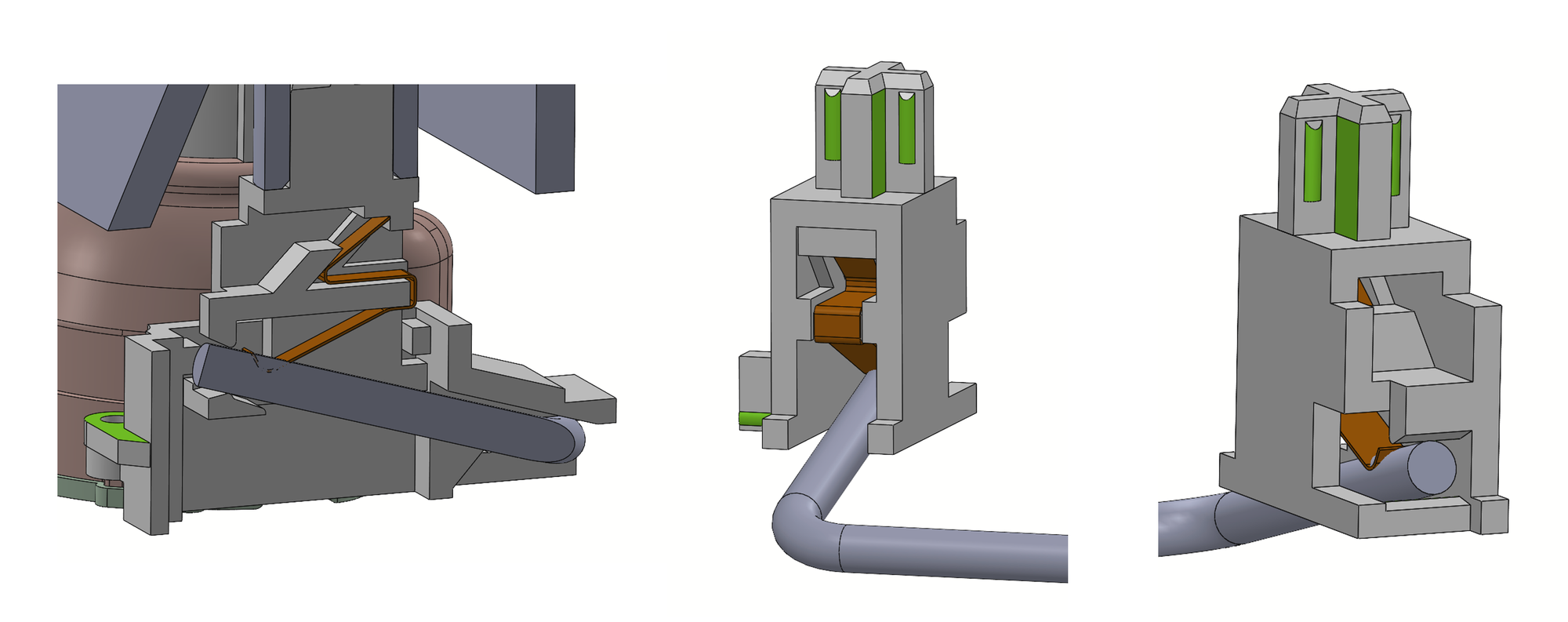 My prior design required a 0.3mm clearance between wire and housing to prevent binding but, due to the kinematic optimization, this preload beam was able to be added, moving us instead to a zero clearance (i.e., completely noise-free) interface.