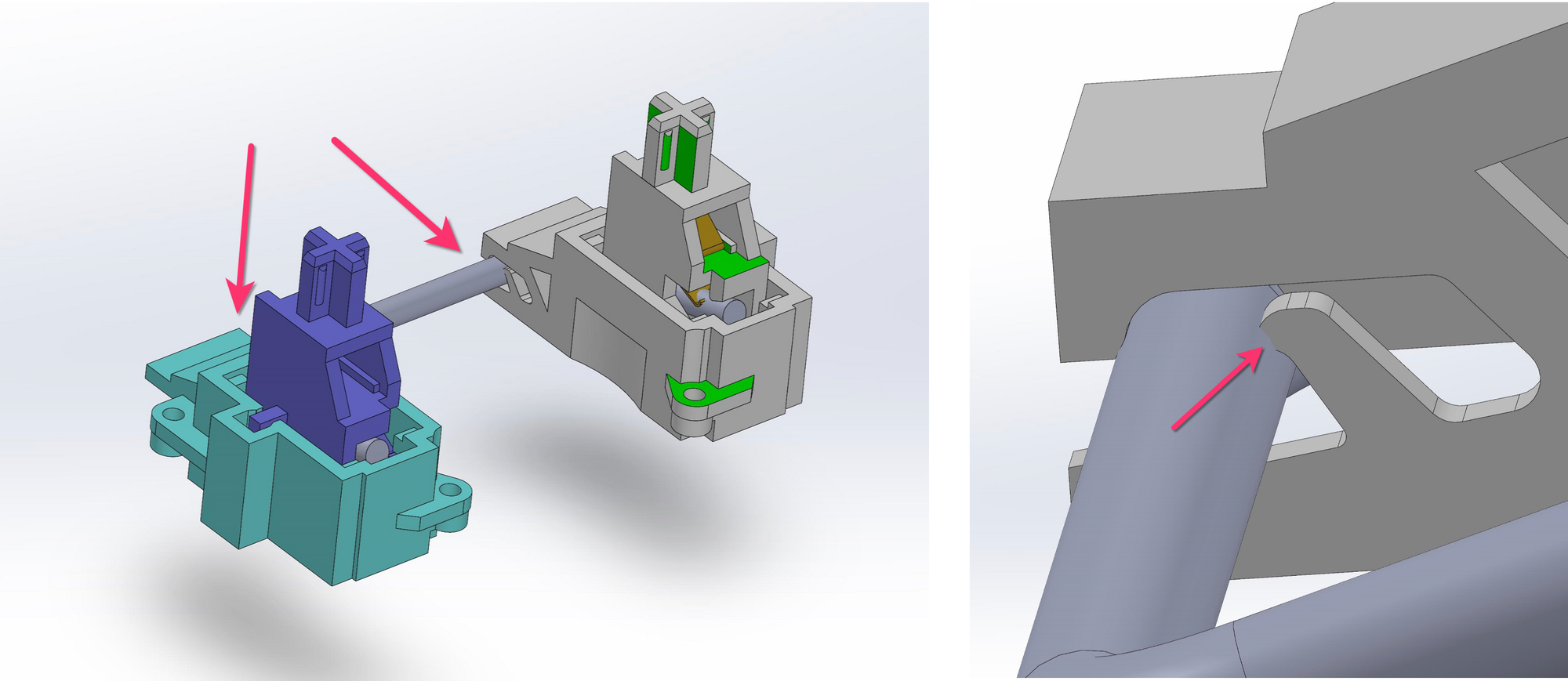 There are thirteen types of generic joints in mechanical engineering, but there is a design rule of thumb related to joint selection: whenever you can use a pin joint, do. There are many reasons for this, depending on the application, but in our case one of the most compelling is that it would allow us remove an injection molded part from each mating surface, replacing it instead with a metal pin. Precision metal pins are manufactured using a rolling and grinding process, making them massively more dimensionally accurate and uniform compared to injection molded parts. The interface tolerances of joints employing them can become much tighter as a result, allowing for effectively zero clearance at all interfaces and thus the total elimination not just of rattle but ticking. For 4mm of switch travel, we are moving our parts very little about tiny pins compared to the length of 4mm slide, making it effectively a gearing rather than a simple 1:1 ratio as with the slider. The math works out such that we experience 1/10th of the friction compared to a sliding joint. Using a plastic-to-steel pairing is a further significant reduction in friction compared to the prior plastic-on-plastic slide.