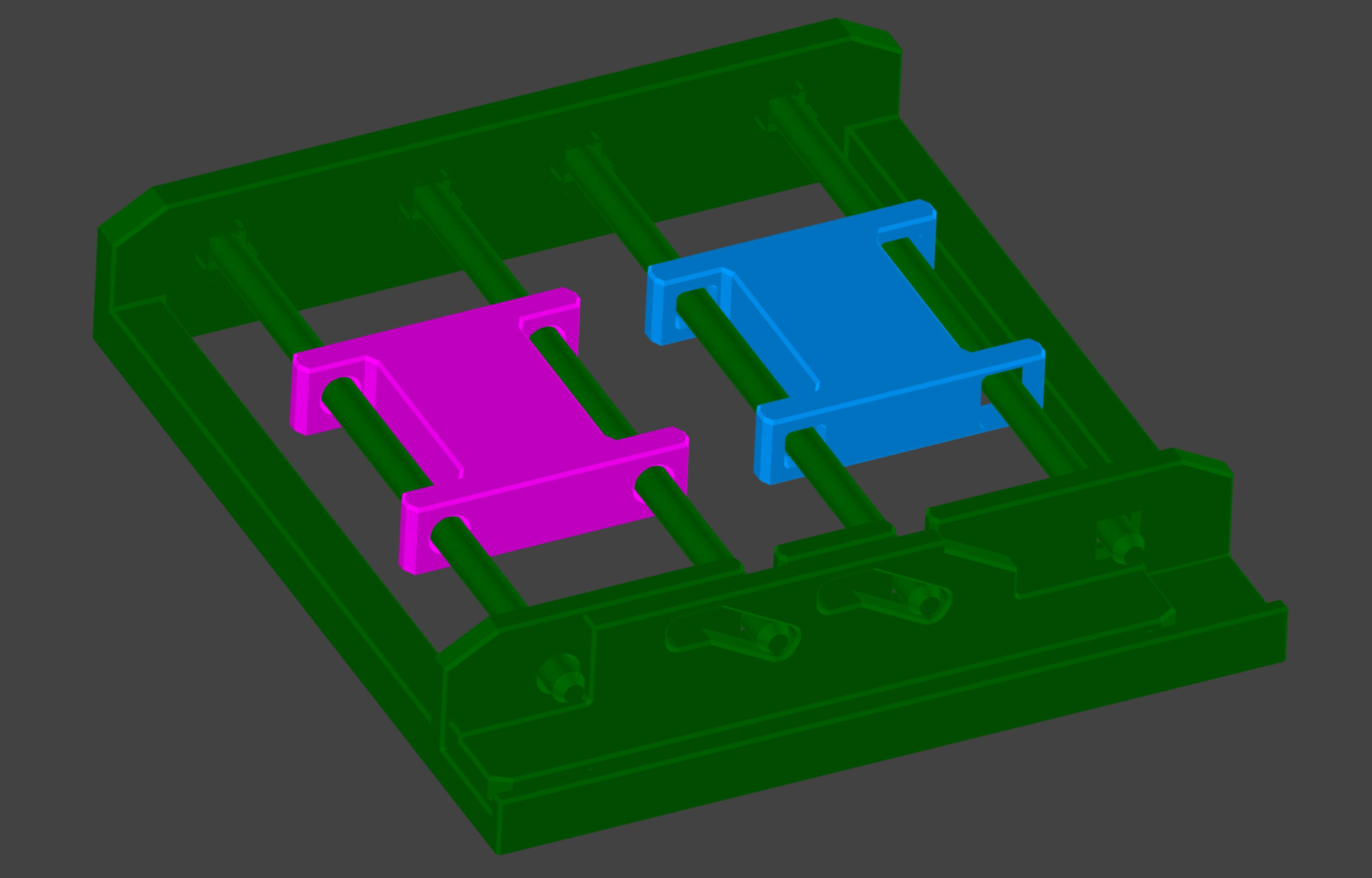 To demonstrate the idea, let us return to the concept of a simple linear bearing sliding along two rails that I introduced before. In a classic RD8 example below, there are two such sliding carriages: one magenta and one blue.