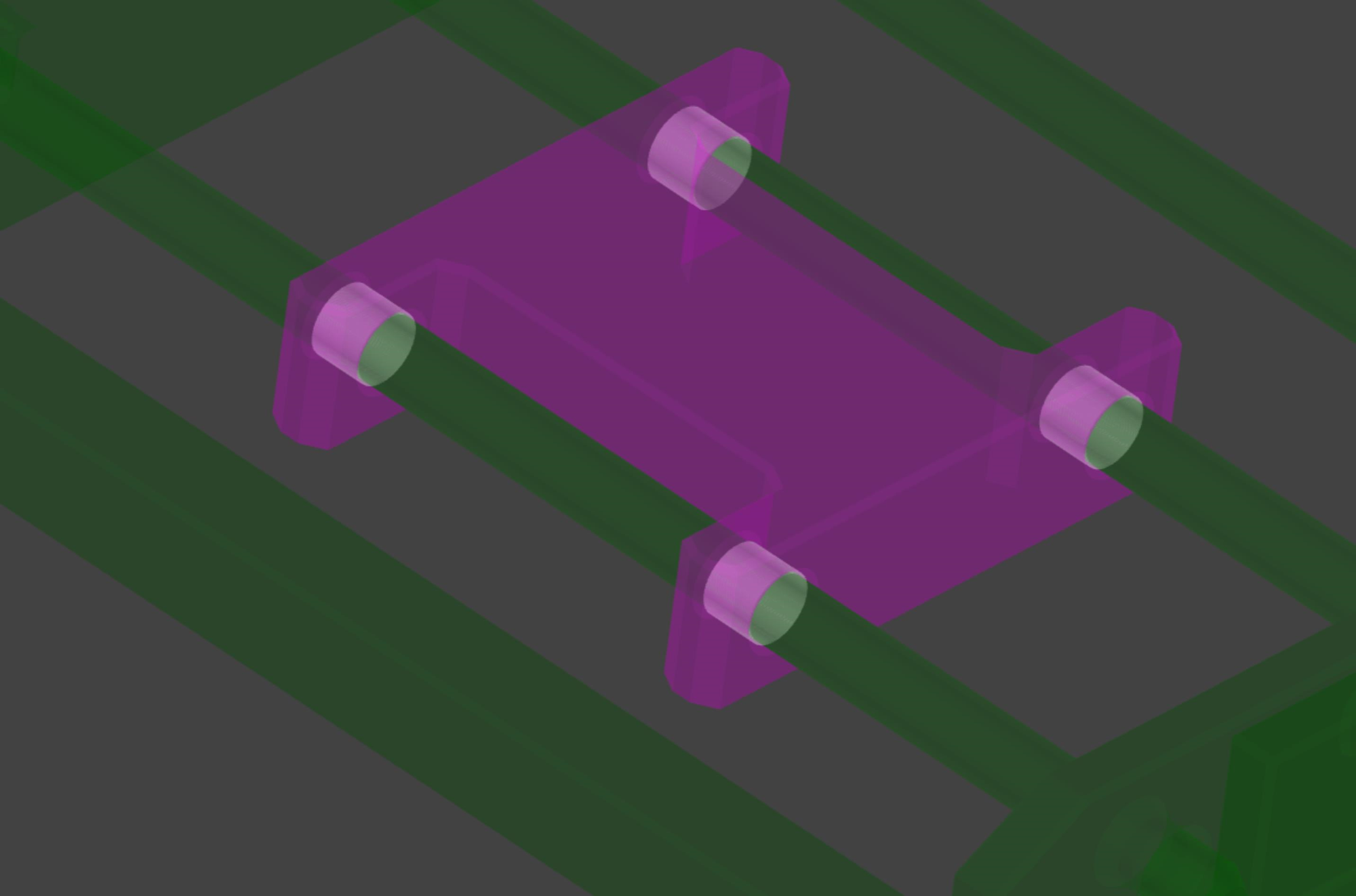 This is because the magenta carriage, even though it using a very common design for such bearings, is actually kinematically over-constrained. It uses four cylindrical mating surfaces to run along the rods, as shown in white below. The redundant constraints unnecessarily make the system highly sensitive to manufacturing variations or other sub-optimal mechanical conditions.